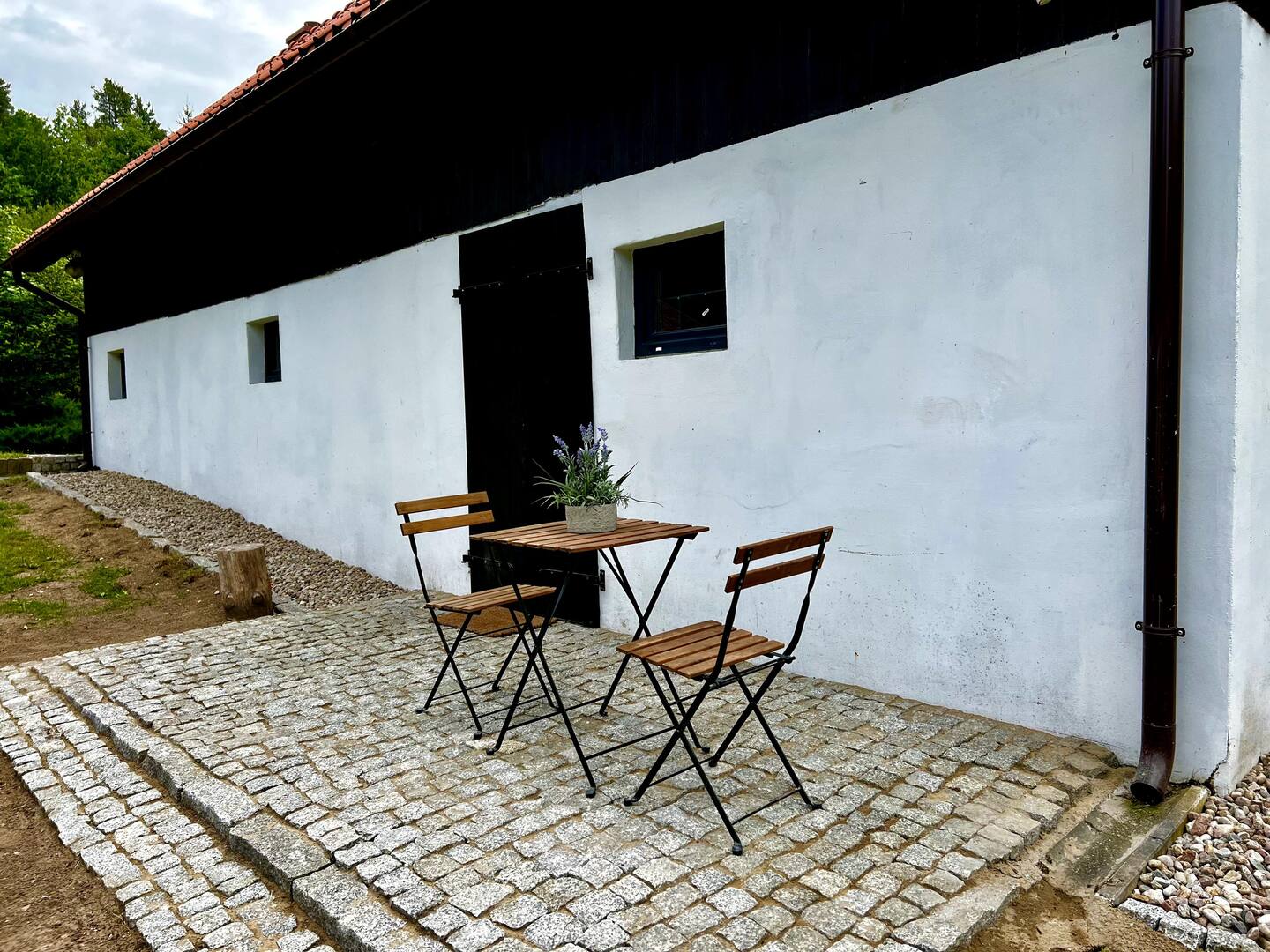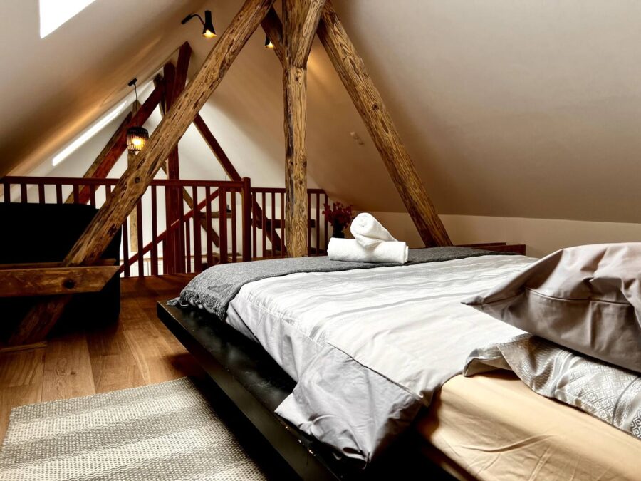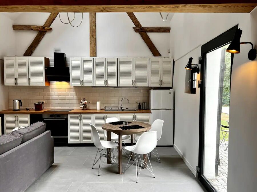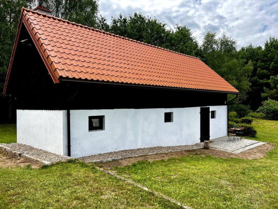 Projekt rewitalizacji zakłada aranżację budynku gospodarczego na funkcję mieszkalną. Formę architektoniczną zaadaptowano jako nowoczesną stodołę zintegrowaną z krajobrazem leśnym otoczenia. Wnętrza utrzymane są w jasnej kolorystyce, zastosowane drewniane belki i podłogi podkreślają rustykalny klimat. Nowoczesny minimalizm zapewniają natomiast chłodne biele na ścianach, szare posadzki oraz układ otwartej przestrzeni z sypialnią na antresoli.