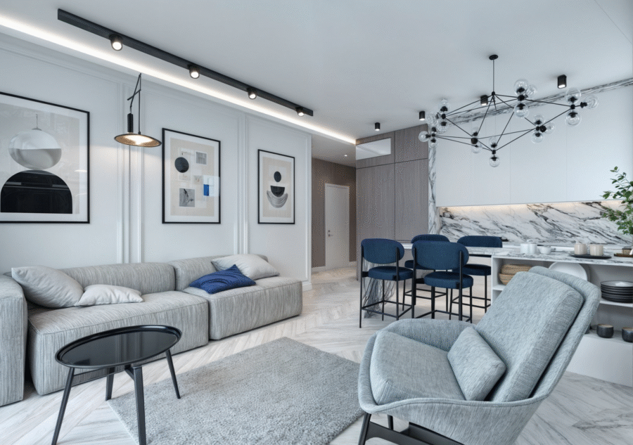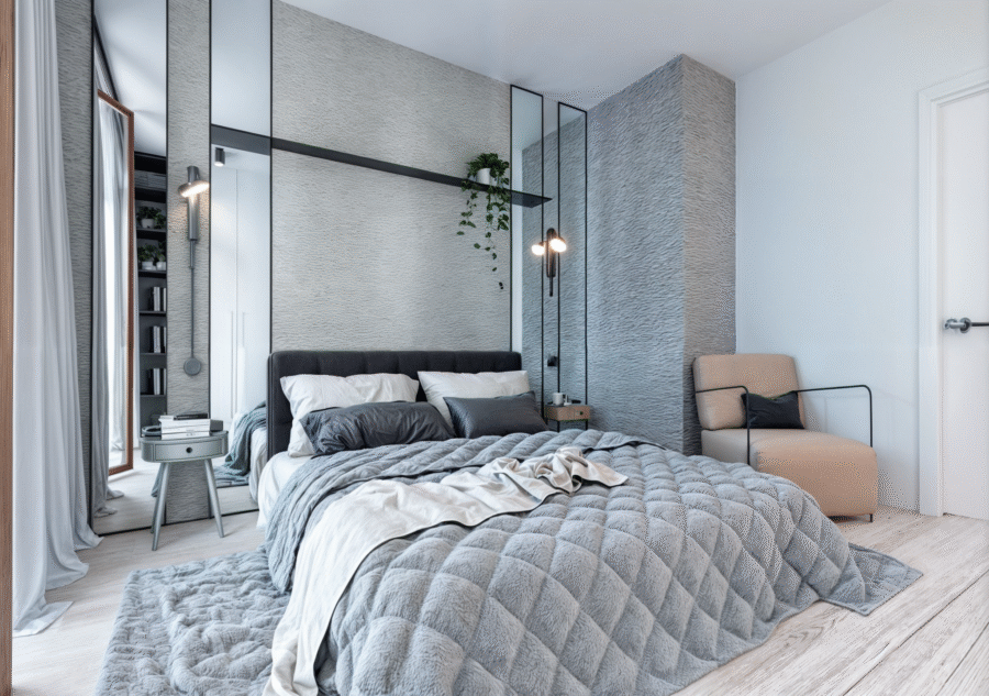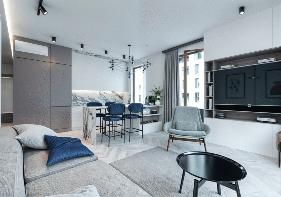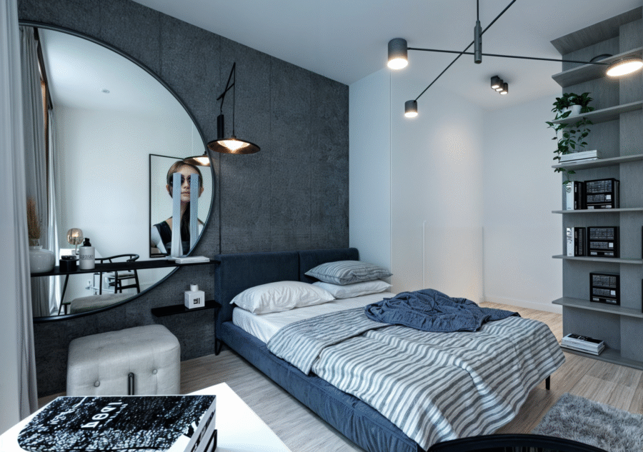 Charakterystycznym i praktycznym elementem aranżacji wnętrza są szafy w zabudowie, występujące w holu oraz obu sypialniach. Drzwi do jednej z sypialni to tzw. drzwi ukryte, są spójne kolorystycznie ze ścianą.
