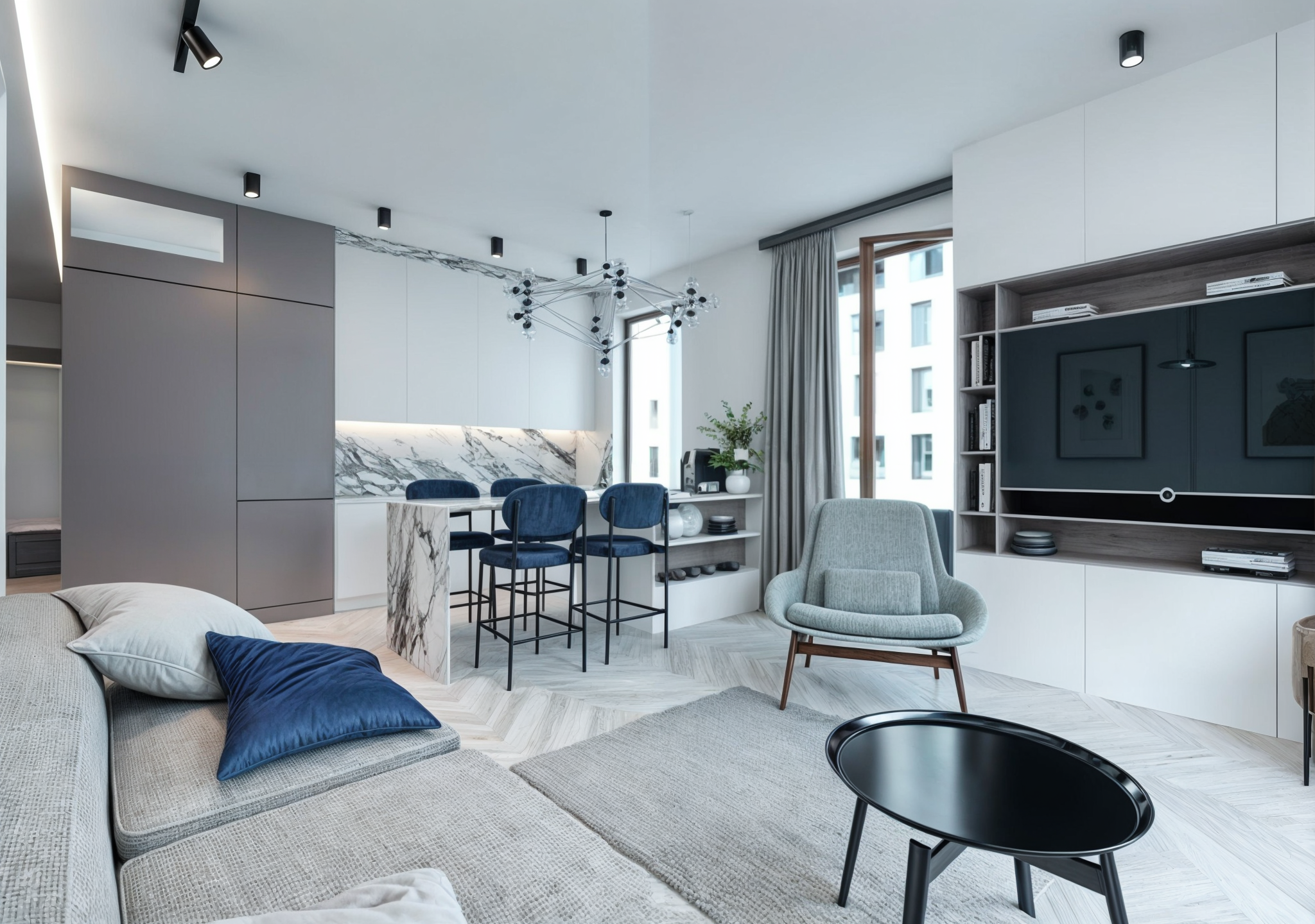 Projekt trzypokojowego mieszkania na parterze z wyjściem na ogród. Otwarty salon z aneksem kuchennym oraz sypialnie utrzymane są w jasnej, biało-szarej kolorystyce, przełamanej elementami brudnego różu oraz błękitu.